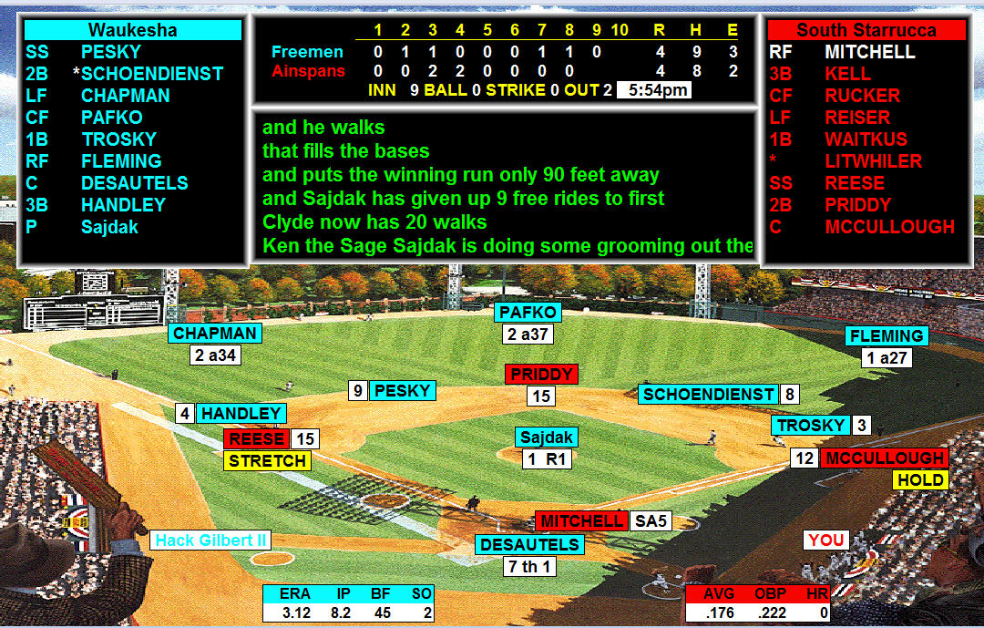 Comments – Marty Fiehl - (Reporting a series vs. Ken Sajdak’s Waukesha Freemen) Ol’ Sajdak’s motto might be something like, “don’t look back, cuz someone may be shooting at you!”………….but The Sage was called upon to start game two of the SS/WA series on very short notice, and as these things sometimes do, his efforts turn out to be quite surprising. First of all, GAME 1 went fairly according to plan that Starrucca had hoped for. We kept the Freemen from ANY xbase hits, had 3 no-hit relief innings from our bullpen to finish it up……………..yet somehow, and we’re still scratching our head on this one; we lost 4-3. It FELT like we were winning and doing good; but the final score disputes that. So we move to game 2 and Ken the Sage is summoned by the clan to represent the family on the pitching mound. The Freemen give him an early 2-0, he pisses that one away with back to back 2 run innings. He comes back to the dugout and tries to explain that “it could have been worse”, and he ain’t lyin. Starrucca thought they were going to blow it open right then and there, though even if they got that ONE more run, I don’t see how he could have been downgraded lower than the 1. Ken broke off a fresh chaw, went back out on the mound, and somehow managed to toss four SCORELESS innings to keep his crew in it. During which they chipped in with a run here a run there, and Waukesha TIES it up, 4-4. That takes us to the Bottom of the NINTH! Sajdak retires the first TWO batters of the inning! He’s a grade freaking 1 and he’s pitching into the ninth inning! I’m wondering what Hack Gilbert 2 is doing the last few innings, I know they didn’t have laptops and the Internet in those days, so he couldn’t have been bidding on a spittoon on Ebay, but he had MOST of his relievers ready to go. Freemen don’t have a GREAT pen, but they have a few guys, and ALL of them are better than grade 1 Sajdak. On the other hand, if Ken can get ONE more out, he makes it to FIVE shutout innings, and he gets advanced. Maybe Hack is thinking in those terms. So what happens? He WALKS the next batter. And then he WALKS the next batter. Surely the mgr is going to walk out here and hook him. Nope. He walks the THIRD batter in the row to load the bases, in a tie ballgame in the bot of the 9th. Dale Mitchell steps to the plate….. Mitch only walked ONCE in that ML season, so he isn’t a big base on balls candidate. BUT….he was only up to bat 45 times………..and he hit .432 !!!! So I basically couldn’t have HAD a better hitter at the plate. He’s announced, I expect a fresh reliever…………….but nope. Hack Gilbert is still in the locker room, sniffing old socks or something. He doesn’t want to come out on the field. The Sage has faced 45 batters to this point!!!