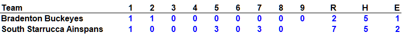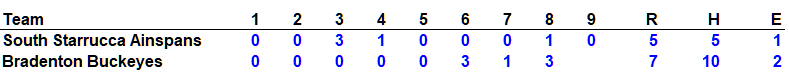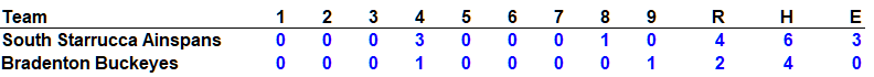 unless you’re talking about celebrity deaths”. And this applies to last game, too! Wild Bill Donovan starts on the mound for Bradenton and he is true to his name today. He issues 5 walks in 6 innings, along with giving up 4 runs. His defense did him no favors. With a 4-0 lead into the 6th inning, Starrucca looked like they were going to roll 7’s thru 9 innings. But then the upper half of the Buckeye lineup woke up and started getting hits and xbhits like they were batting off of a tee. 3 runs, 1 run, 3 runs in the 6th/7th/8th……with that last 3 spot pushing them into the lead, and they set down the Ainspans in the 9th for a strong 7-5 win! Series now 2-1 Starrucca